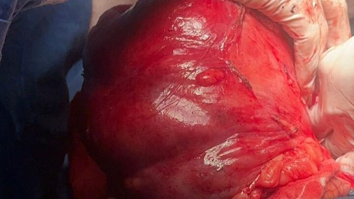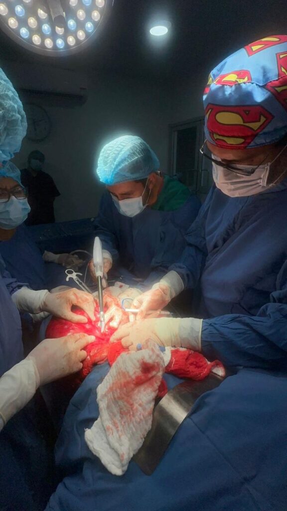 Doctor Juan Carlos Pacheco extrayendo liposarcoma retroperitoneal en Sonodigest, Centro de Cirugía Ambulatoria